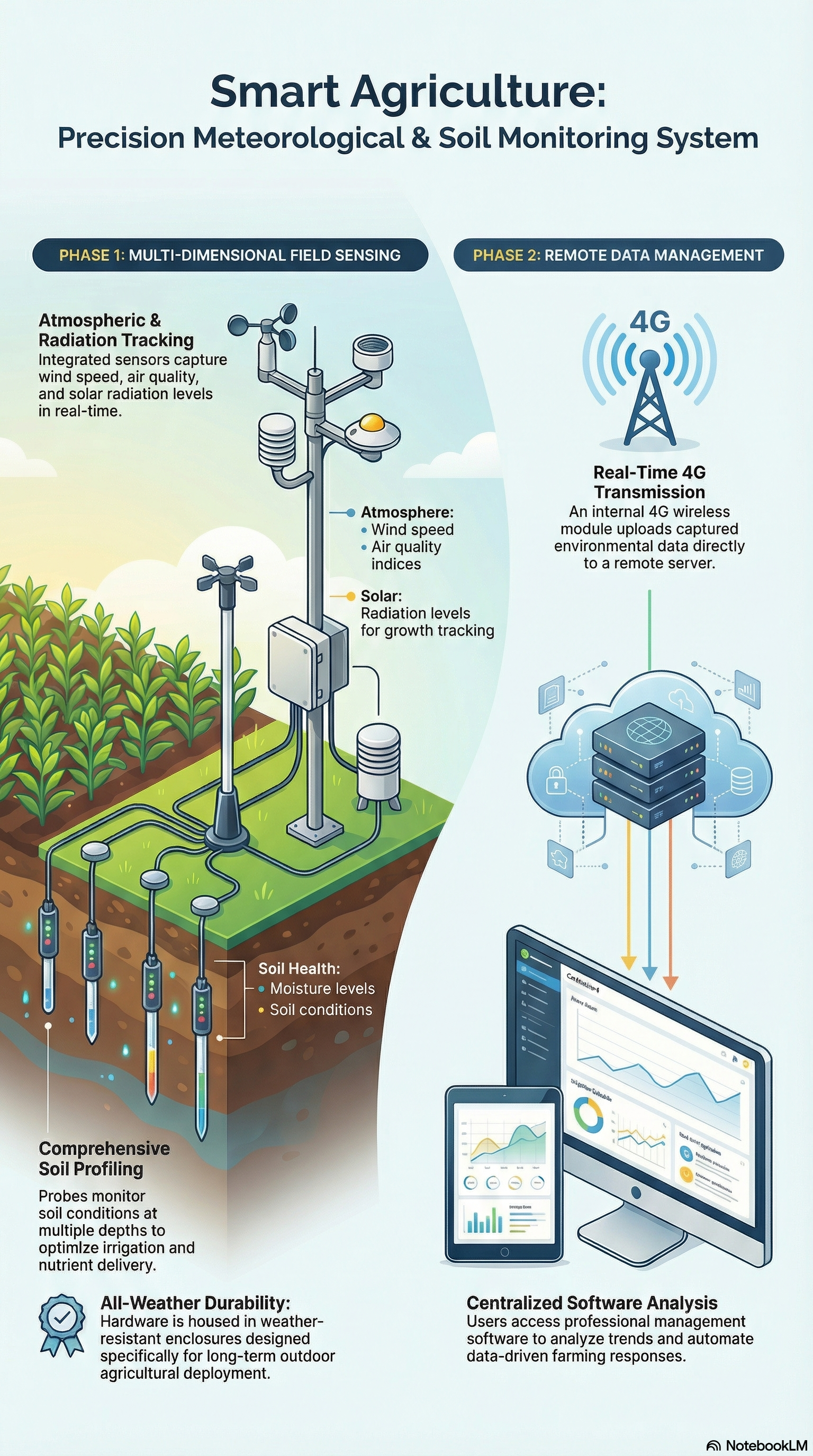 An kev sib xyaw ua ke 4G kev saib xyuas ib puag ncigyog ib qho kev daws teeb meem kev lag luam uas sib koom ua ke uas muab cov cua ceev / kev taw qhia, huab cua zoo, ntau qhov tob av, thiab lub hnub ci hluav taws xob sensors nrog lub centralized 4G wireless module rau real-time telemetry. Tsis zoo li fragmented DIY setups, qhov architecture no consolidates cov ntaub ntawv ntws los ntawm ntau yam sensors rau hauv ib lub server-side dashboard. Los ntawm kev tswj hwm fais fab thiab kev sib txuas hauv lub ruggedized hub, nws tshem tawm cov kev pheej hmoo sib xws, muab cov koom haum ib txoj hauv kev turnkey rau kev tshaj lijkev siv tshuab ua kom cov ntaub ntawv ua haujlwm tau zoothiab kev saib xyuas ib puag ncig thoob plaws hauv cov chaw uas tsis muaj cov khoom siv network uas twb muaj lawm.
